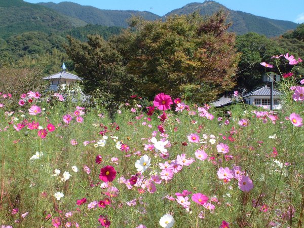 - 本日も快晴となりました。道の駅「花の三聖苑」のコスモス畑はそよ風に揺られながらたくさんの花を咲かせています。