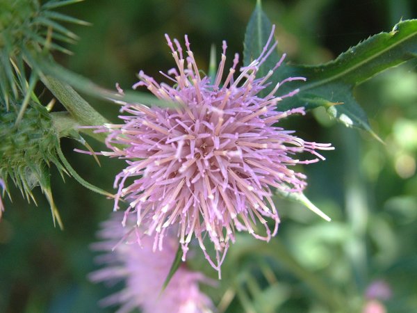 - 山道を歩くとノアザミが咲いています。刺々しい花ですが、とても綺麗なうす紫色をしています。