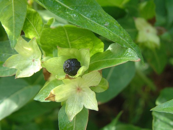 - オシロイバナの花が咲き、白粉のはいった黒い実もつきはじめています。