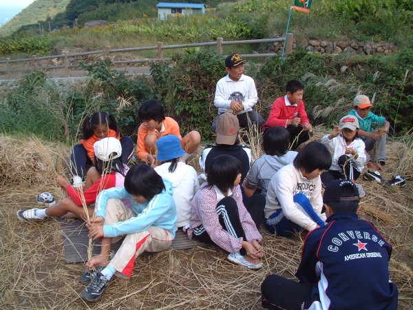 - 石部棚田にある三浦小児童で耕作する田の脱穀作業が行われ、高学年生の指導により稲で縄つくりにも挑戦しました。