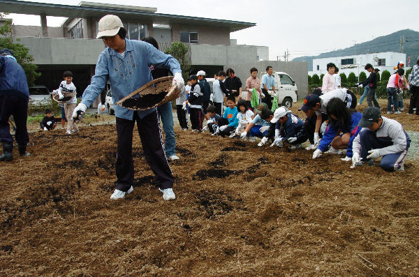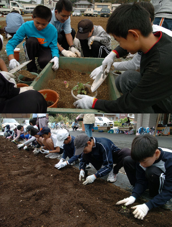 - 町内小学生で構成する「みどりの少年団」、「三聖塾」では、松崎十字の園花壇の花植えを行いました。