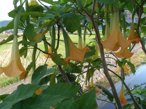 - エンゼルストランペットの大きな花が町内各所で見られます。