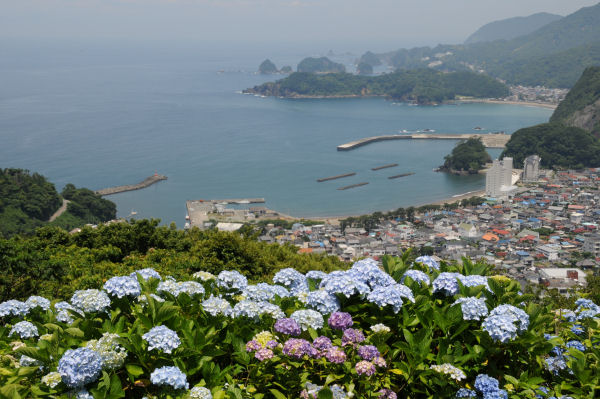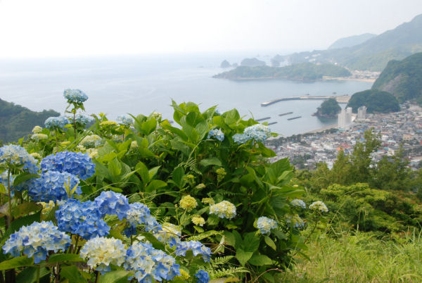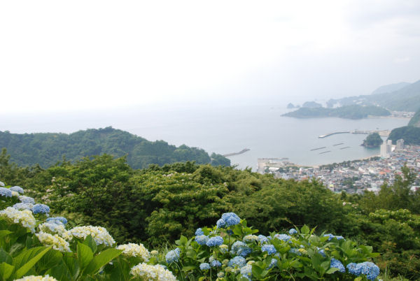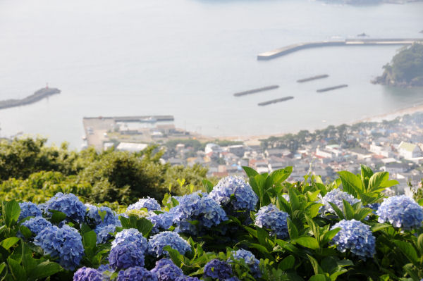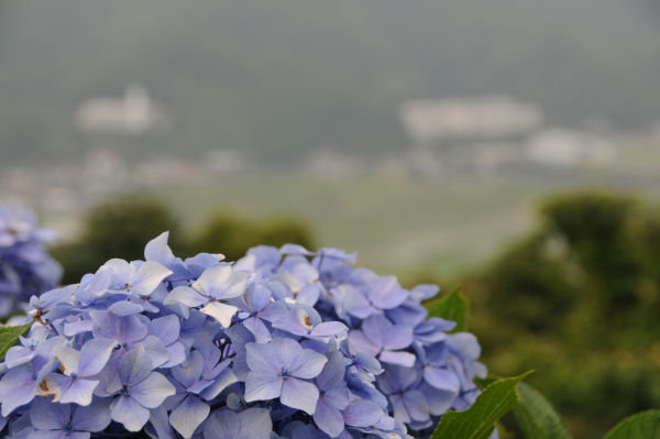 - 牛原山あじさいの丘では、あじさいが見ごろを迎えました。あじさいと眼下に広がる町並みがとてもきれいです。