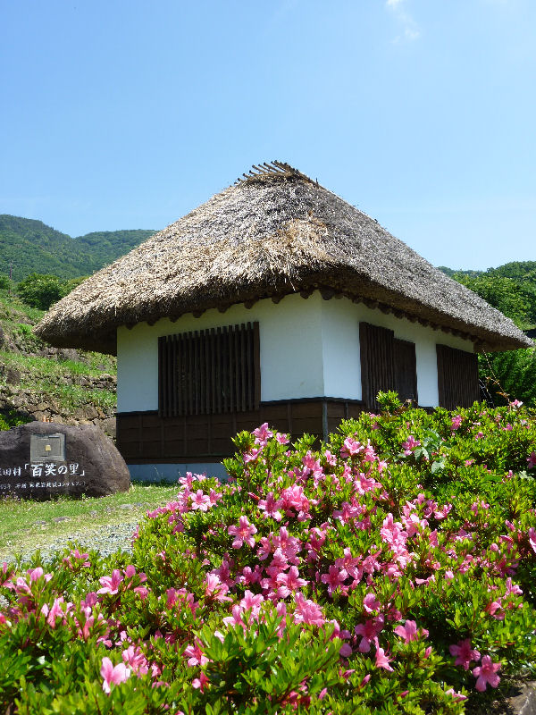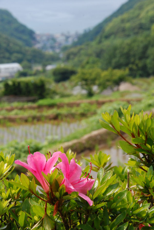 - 石部棚田にある、水車小屋の前で、サツキが咲いていました。鮮やかなピンク色の花をつけています。町内の他の地区でも咲き始めているようです。