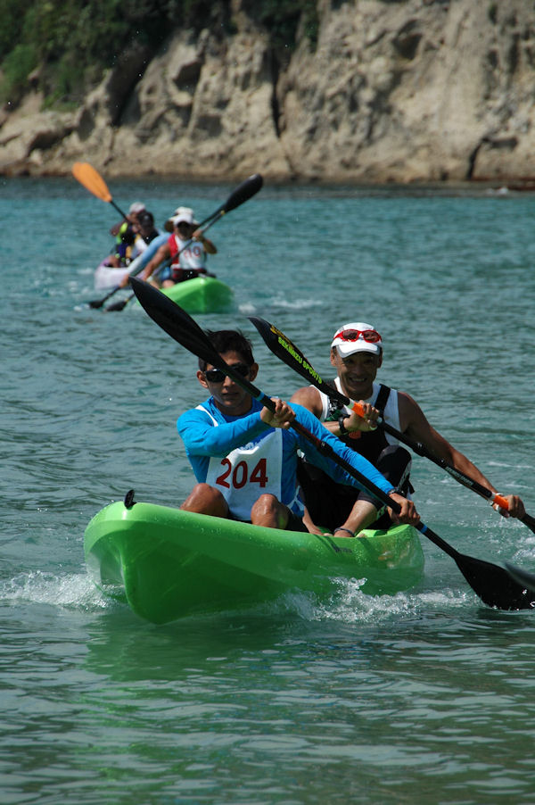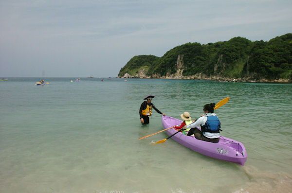 - シーカヤックマラソンゴールまでの待ち時間に、カヌー体験が行われました。 操作の基本を教わり、次々に岩地の湾に漕ぎ出し自然を満喫体験しました。