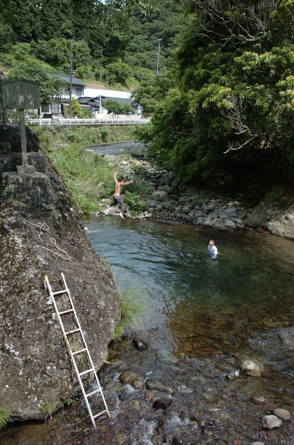- 今日は暑い一日となり、大沢の佐二平さんの淵では、子供たちが泳いでしました。 佐二平さんのいる岩の上から淵めがけ、次々とダイブしていきます。