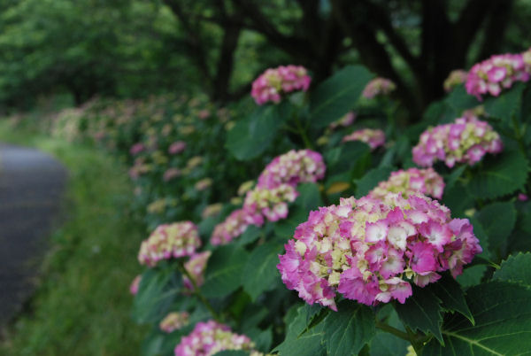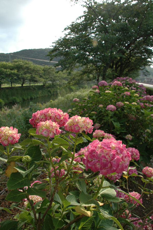 - 那賀川堤のアジサイも日増しに色づいてきています。こちらは、牛原山の青色のアジサイと異なりピンク色の花を付けています。