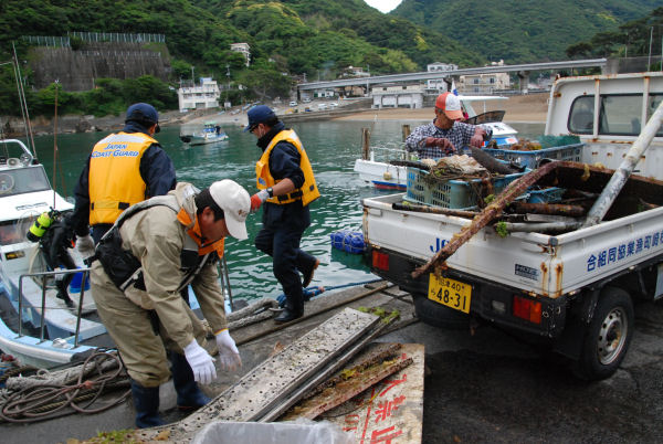 - 雲見漁港では、漁場の保全と海岸の環境美化を目的にダイバー約30人と地元の漁業関係者有志が協力して海底清掃が行われました。約2時間の清掃作業で軽トラック1杯分のゴミを収集しました。