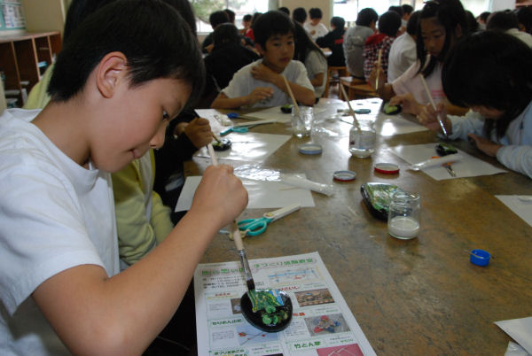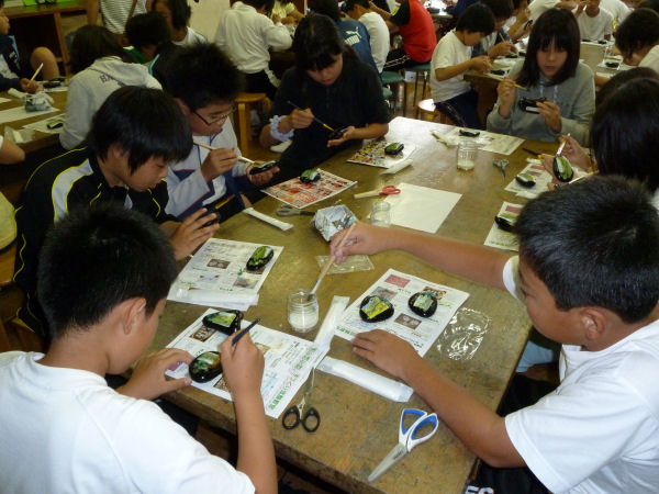 - 松崎小学校では、10月に行われる棚田サミットにて来場者に記念品として配布されるいづこいしの制作が行われました。