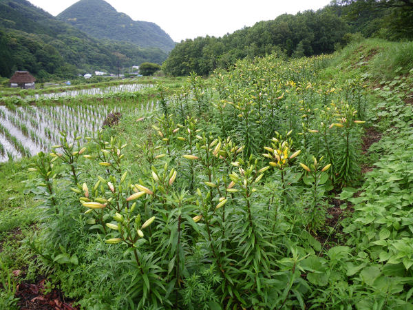 - 石部の棚田では、昨年より10日ほど遅くスカシユリが咲き始めました。まだ開花しているものは数輪ですが、つぼみも大きくなっていますので、1週間ほどで見ごろを迎えそうです。