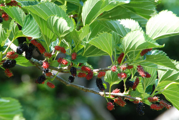 - 町内のさまざまな場所では、桑の木が枝いっぱいに実を付けています。