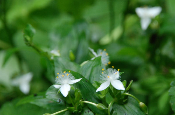 - 町内の少し日当たりの悪い空き地や道路沿いなどでは、トキワツユクサが小さい三角形のまっ白な花を咲かせています。