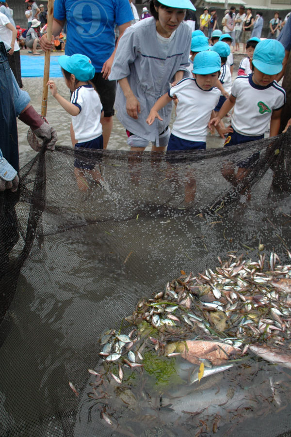 - 賀茂地区1市3町の保育園児190人が岩地海岸で地引網を体験しました。捕れた魚は各園に持ち帰り、調理され給食のときに園児たちに振る舞われました。