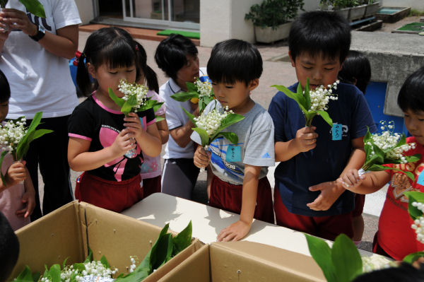 - 姉妹都市の北海道帯広市から初夏の花「スズラン」が届き、町内の学校や幼稚園などに配布しました。受け取った園児たちは、鈴なりの小さな花の香りを楽しみました。
