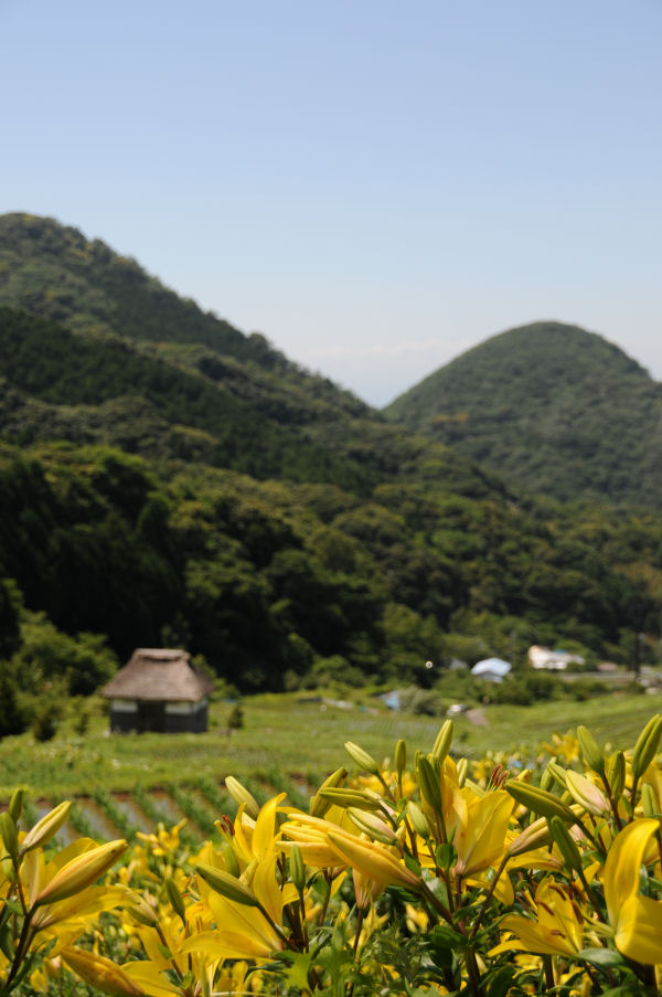 - 石部の棚田では、スカシユリが見ごろを迎えました。緑一色となった棚田に鮮やかな黄色が目立っています。