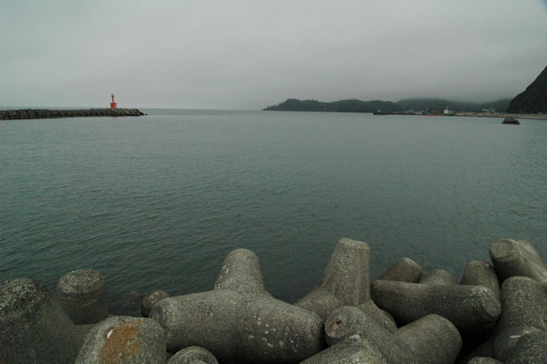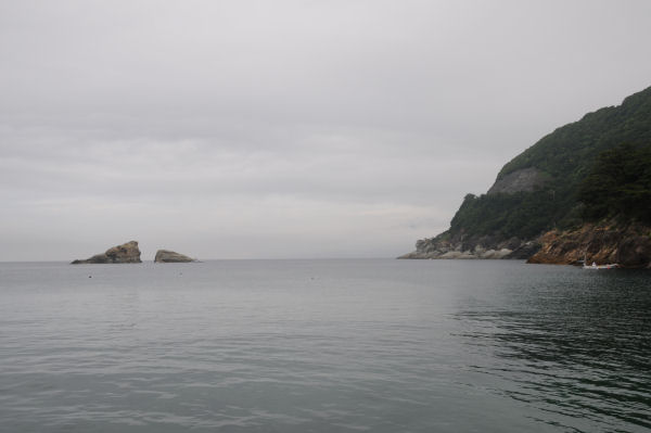 - 今日は一日どんよりと灰色の雲が張り詰めています。 時折小雨もぱらつき、松崎港からの眺めも、梅雨の色合いとなっています。