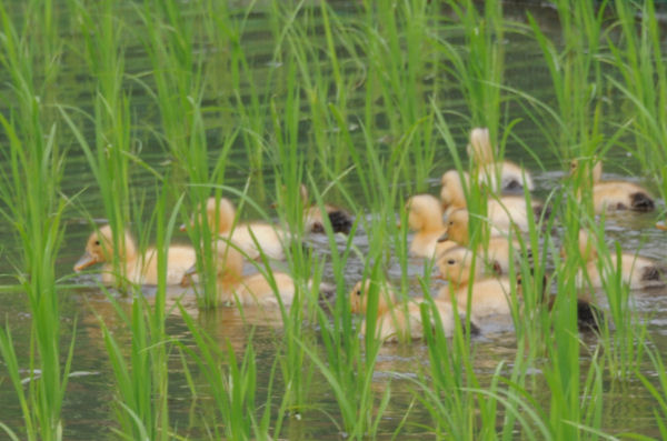- 中耕地のアイガモ農法を行っている田んぼでは、小さなアイガモが群れを作って泳ぎまわっています。
