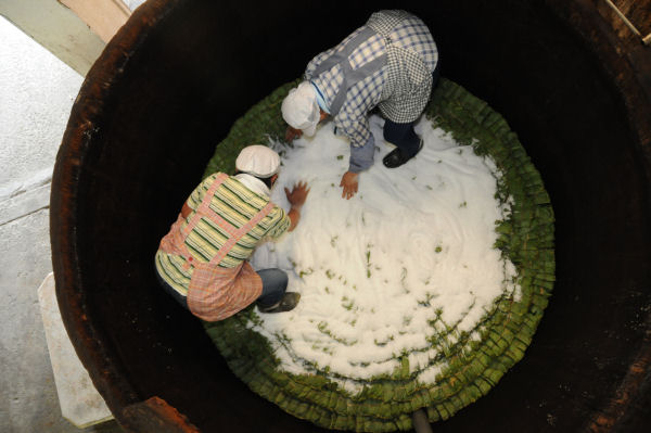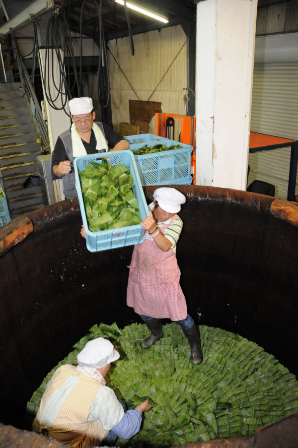 - 松崎町が日本一の生産量を誇る桜葉の漬け込み作業が最盛期を迎え、漬け込み業者では、50枚づつ束ねられた桜葉を直径2メートル、高さ2メートルの樽へ漬け込む作業が行われています。約半年間漬け込んだ後に出荷されます。
