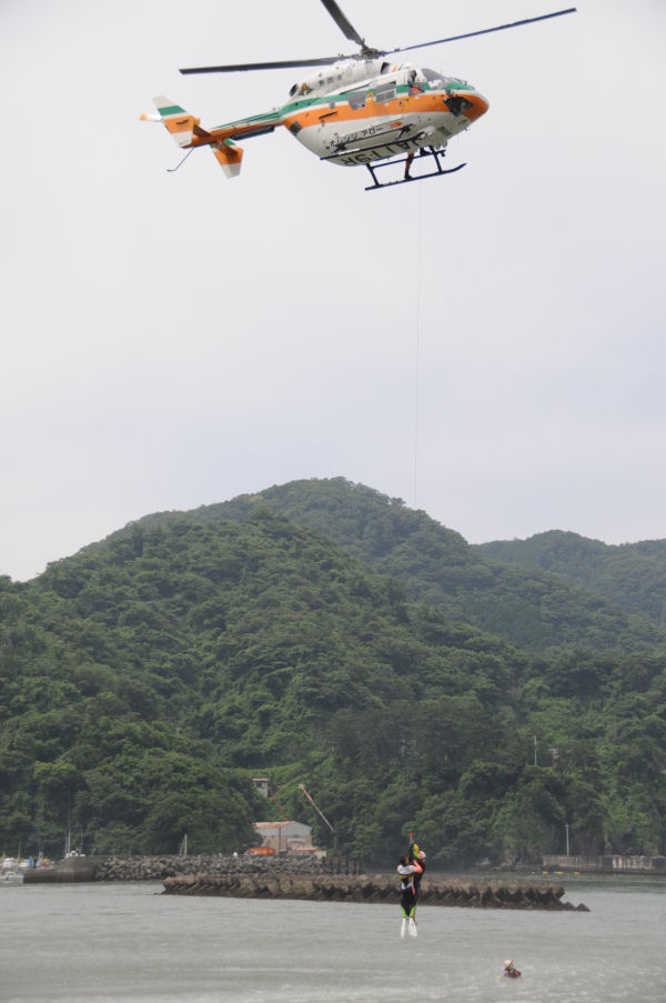 - 松崎海岸では、西伊豆広域消防本部とライフセーバーの方たちによる水難救助訓練が行われました。陸からの救助の他、ヘリコプターを使用した救助訓練も行われました。