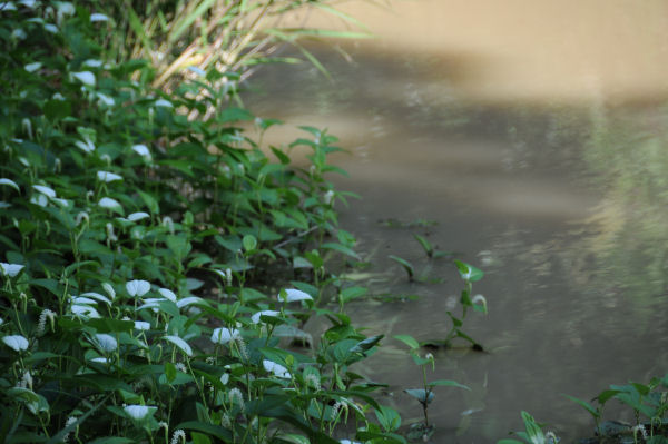 - 沼地では、ハンゲショウが葉を白く染めています。 半分だけ化粧したように白くなることからハンゲショウと言われるようです。