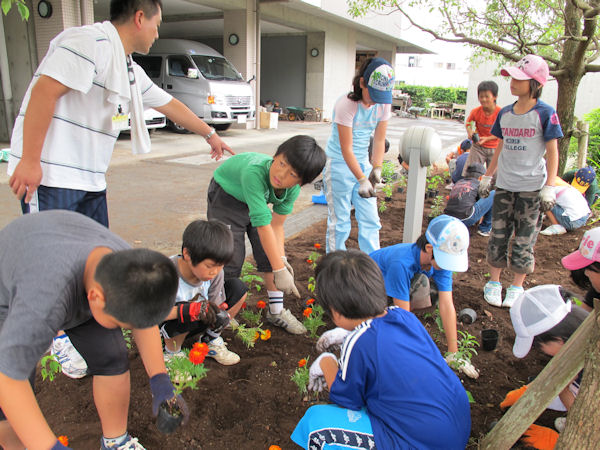- 本日、三聖塾生とみどりの少年団員が十字の園で花壇づくりを行いました。 草取り、土づくりの作業の後松崎中学校からもらった花の苗を、心をこめて植えかえました。