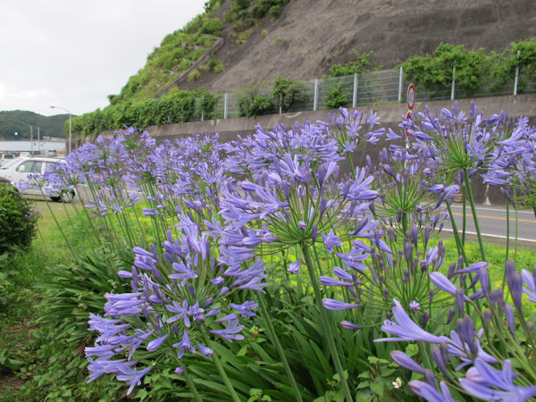 - 西伊豆町との境に位置する外部海岸の園地では、アガパンサスが盛りを迎えきれいに咲いています。