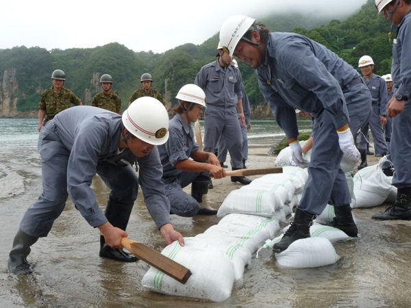 - 本日、松崎町消防団は岩地海岸において水防訓練を行いました。 自衛隊の指導の下、土のうの作り方や積み方を学びました。土のうの正しい活用方法を覚えることにより、水害時の被害を抑えることができます。