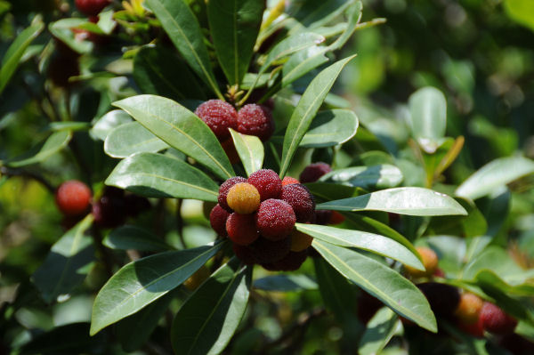 - 町内の公園などでは、ヤマモモが枝いっぱいに実を付けています。最近では、子どもたちも食べなくなったのでしょうか。木の周りには、たくさん実が落ちていました。