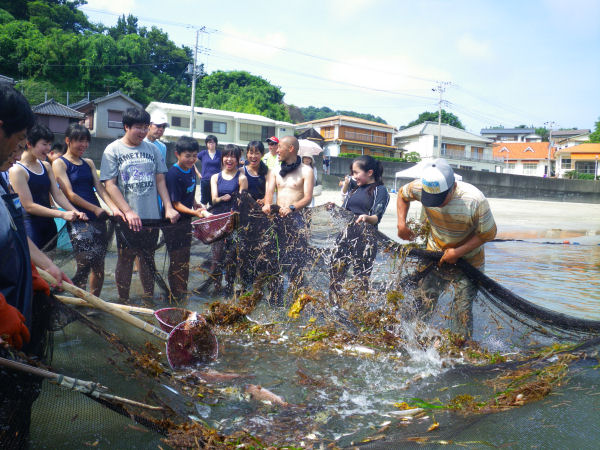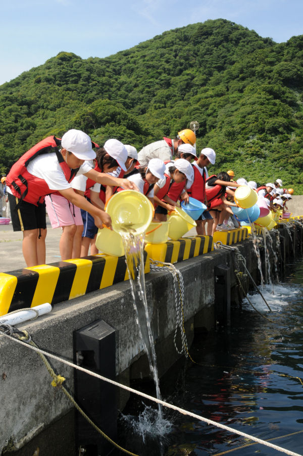- 石部漁港では、漁港工事などを請け負っている株式会社古川組の社会貢献事業の一環として、松崎小学校3年生62人がカサゴの稚魚500匹を放流しました。