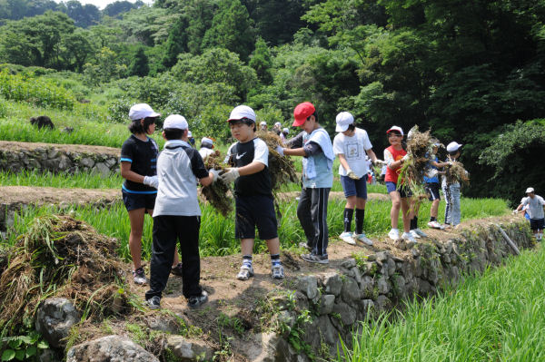 - 今日も夏を思わせる天候の中、石部の棚田では、松崎小学校の5年生が、草刈り後の草の片付け作業を行いました。