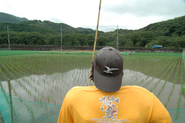 - 那賀耕地には早くもカカシがお目見えしました。 田んぼの端にすっくと立ったカカシは、田んぼのアイガモ達を見守っています。