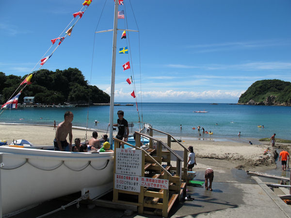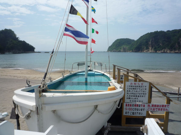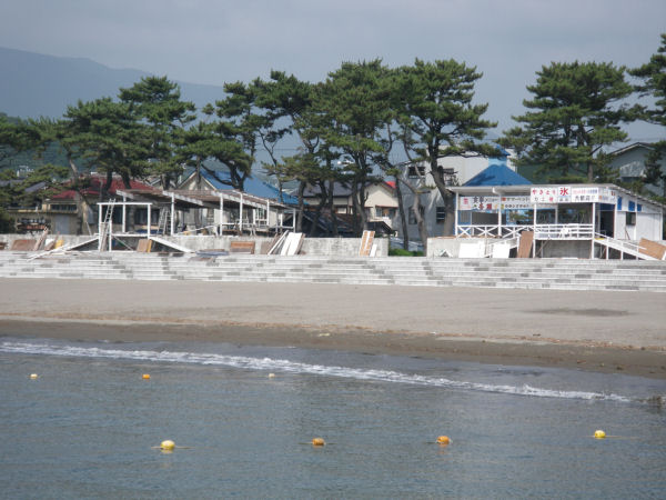 - 今日の岩地海水浴場の様子です。 泳いでつかれた後は、海岸中央に設置された温泉風呂”ダジュール岩地でくつろぎます。