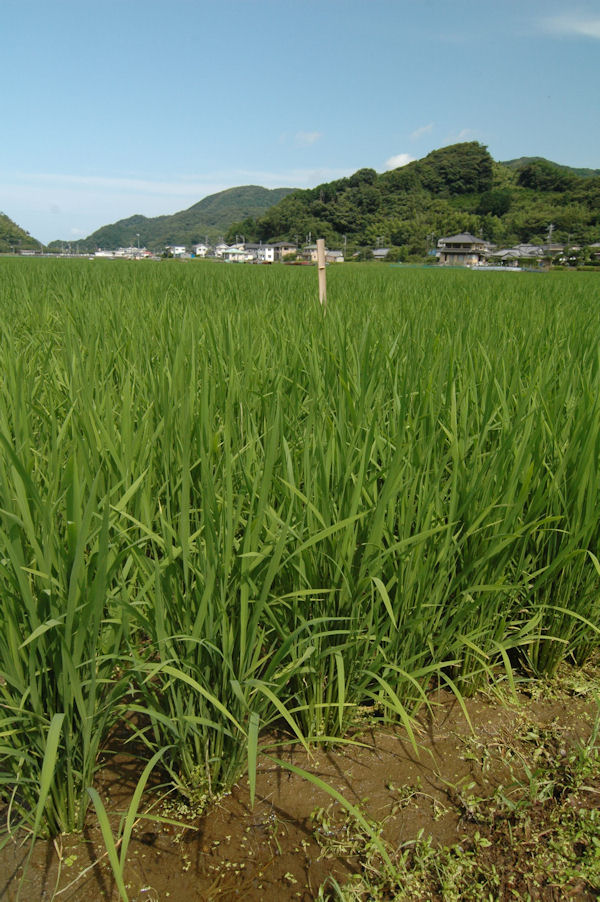 - 花畑でにぎわった中耕地も、イネ育ち青い空に向け大きく育っています。
