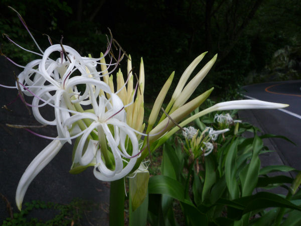 - 町内では、まっ白い大きな花を付けるはまゆうの花がきれいに咲いています。