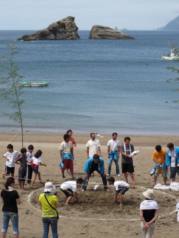 - 雲見区でも夏祭りが行われ、海岸では、子どもたちの相撲大会やスイカ割りが行われました。また、夕方からは太鼓台が地区内を練り歩きます。