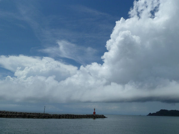 - 昨日昼過ぎからの雨も朝にはやみ、昼には日差しが見えまじめました。 強い日差しと高い湿度でムッとするような、汗ばむ一日となりました。 松崎港からは、青い空に白い雲がまぶしい一日です。