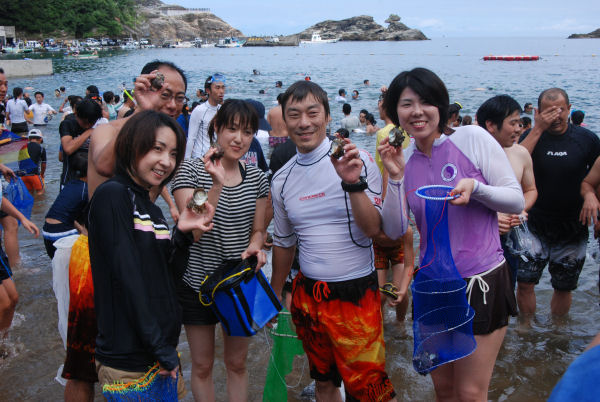 - 雲見海岸では、毎年恒例のさざえ狩りが開催され、多くの行楽客で賑わいました。参加者たちは、合図とともに一斉に海に飛び込み、波打ち際に撒かれたさざえを拾いました。