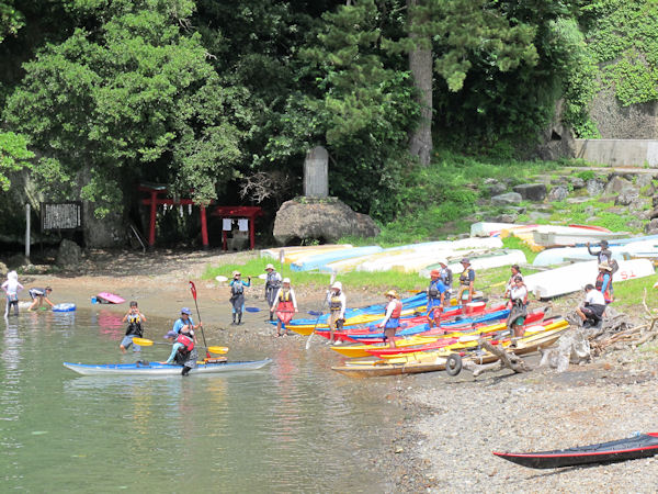 - 松嵜海水浴場端の弁天島付近からは、何艇ものシーカヤックが駿河湾に出て行きました。 快晴に加え、波も穏やかでいいクルージングになったと思います。