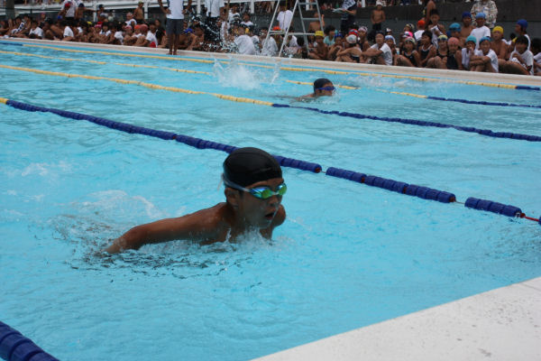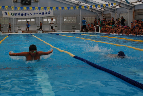- 松崎海洋センターでは、第26回松崎海洋センター水泳大会が開催され、参加した小学生は日ごろの練習の成果を発揮した泳ぎを披露していました。