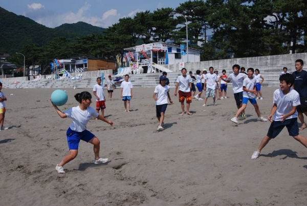 - 午前中に岩地海岸で地引網を楽しんだ訪問団は、午後から松崎海岸で、地元の中学生と交流しながらドッジボールを楽しみました。