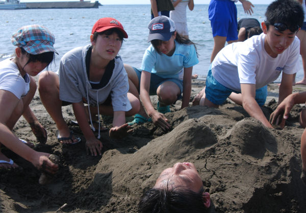 - ドッジボールを楽しんだ後は、シーカヤックや砂遊び、海水浴などをして、海遊びを楽しみました。