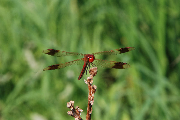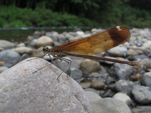 - 河原には川トンボが飛んでいました。 ハグロといわれる羽の黒いトンボのほか、写真のような茶色の羽の川トンボも見つけられました。