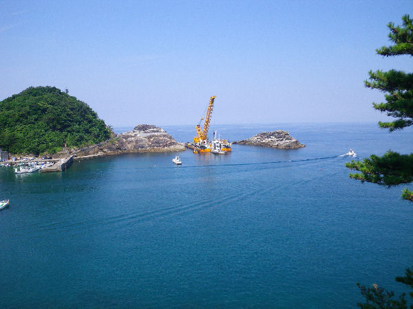 - 今日の雲見港です。 台風の被害を受け、損壊した防波堤付近で、大きな起重機船が作業していました。