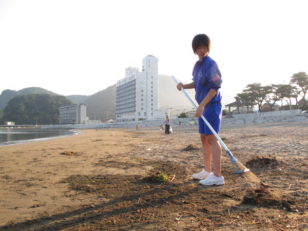 - 今年も、中・高校生ボランティアの協力により、早朝の海岸清掃作業が始まりました。 多くの方に、きれいな浜で海水浴を楽しんでいただこうと、みんな額に汗をかきながらゴミを集めました。 作業は、この夏の間毎日行われます。