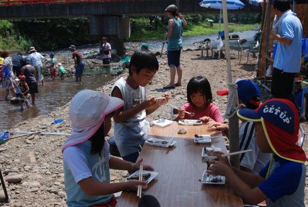 - 今日から8月22日まで、道の駅花の三聖苑裏の那賀川では、鮎のつかみどりが行われています。初日の今日はとても暑く、川遊びにもってこいの天候となり、町内外から多くの行楽客が訪れました。捕った鮎はその場で塩焼きにして食べることもできます。