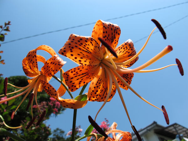 - 青い空に向かって、ユリが大きなオレンジの花を咲かせています。