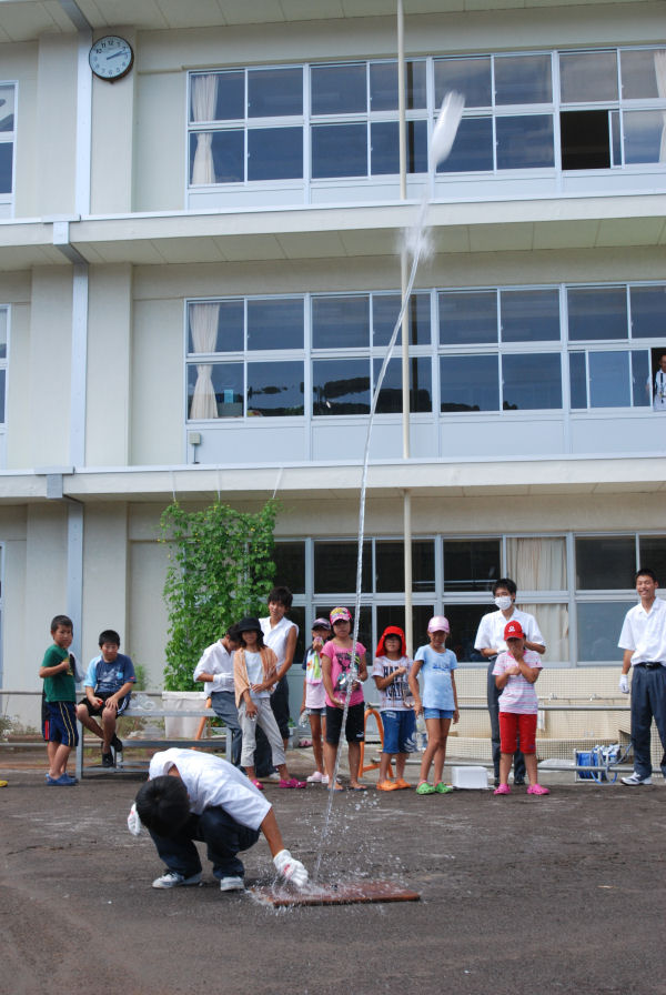- 昨日に引き続き、三聖塾では、午前中に三聖について勉強し、午後からは松崎中学校で楽しみながら科学を学びました。こちらは、ペットボトルにドライアイスと水を入れて作ったロケット飛ばしです。
