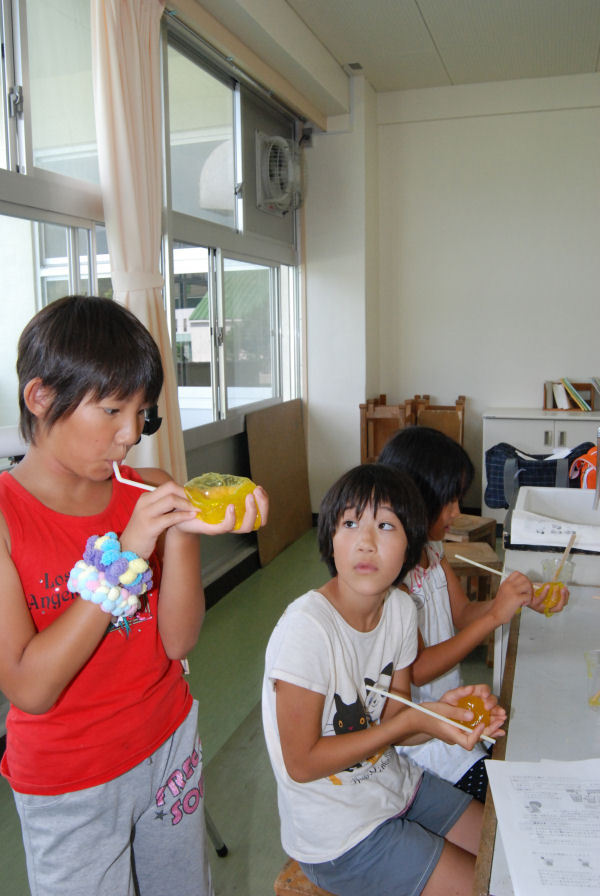 - 理科室では、科学物質を使ってスライムや人工イクラを作りました。