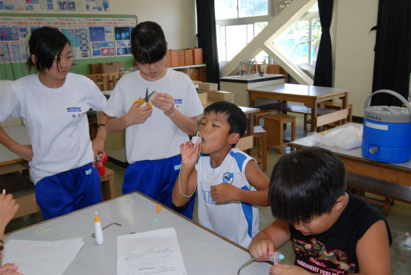 - こちらは、気圧を利用した回る糸作りです。勢いよく息を吹き込むと糸がくるくる回りました。