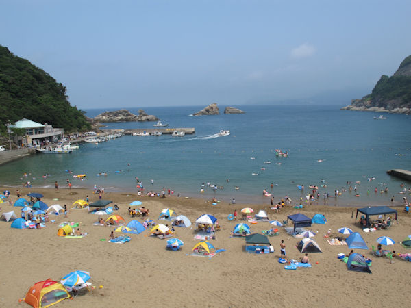 - 早朝パラパラと雨が降ったものの、その後は昨日同様快晴となり暑い陽が照りつける一日となりました。 写真は、午前の松崎海水浴場ですが、午後にはたくさんの海水浴客で賑わっていました。